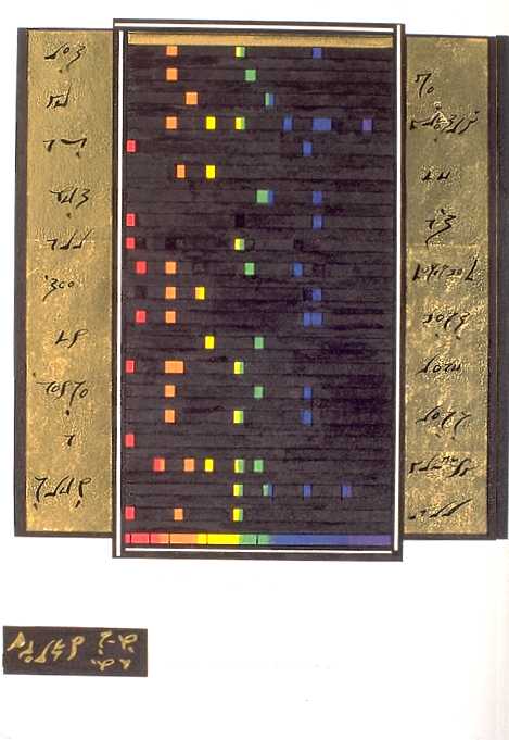 23K gold leaf, pen, brush and ink, coloured pencil, conceptual calligraphy. In private collection. |